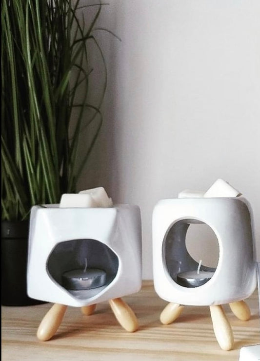 Modern style mini wax and oil warmer with wooden legs. Comes in two styles: hexagon...