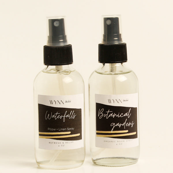 Freshen your home with our handmade room spray featured in a clear glass bottle.
